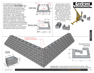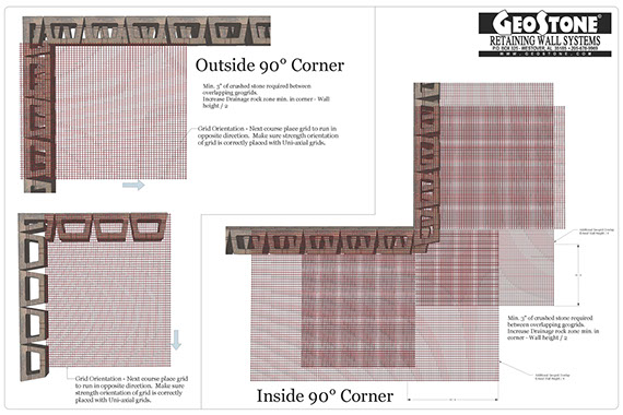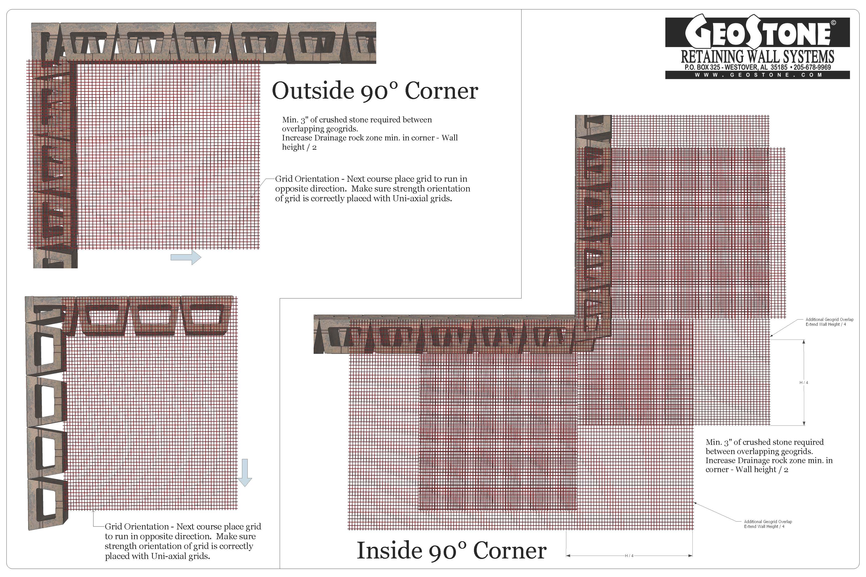 Are very simple. Shown above, interlace the blocks, alternating on each course. Sometimes wall batter will throw this alignment off. Do not worry. It is very common to cut block to fit in corner applications. As a matter of fact, this is the place you will want to make such adjustments as they are not as easy to notice.