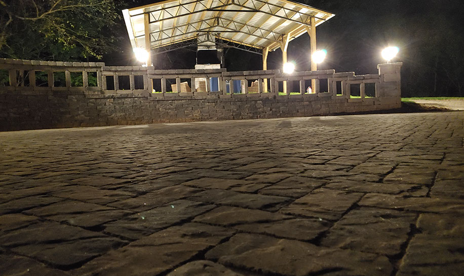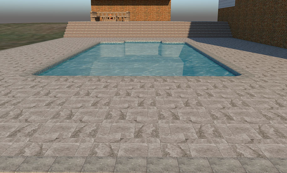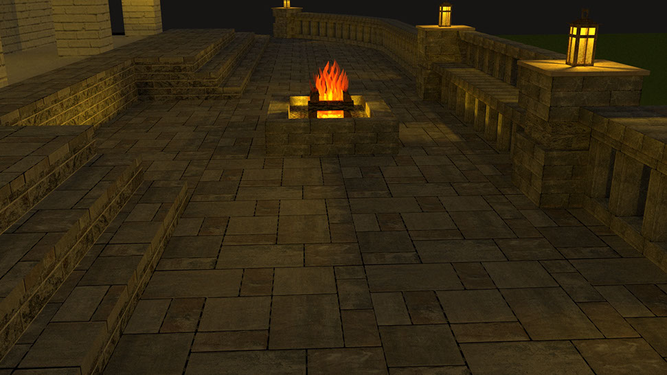 Side rendering of cabana with columns and lights. Notice high-resolution of materials due to custom library. Zooming in on product in 3D app would show actual imperfections in concrete as in real life.