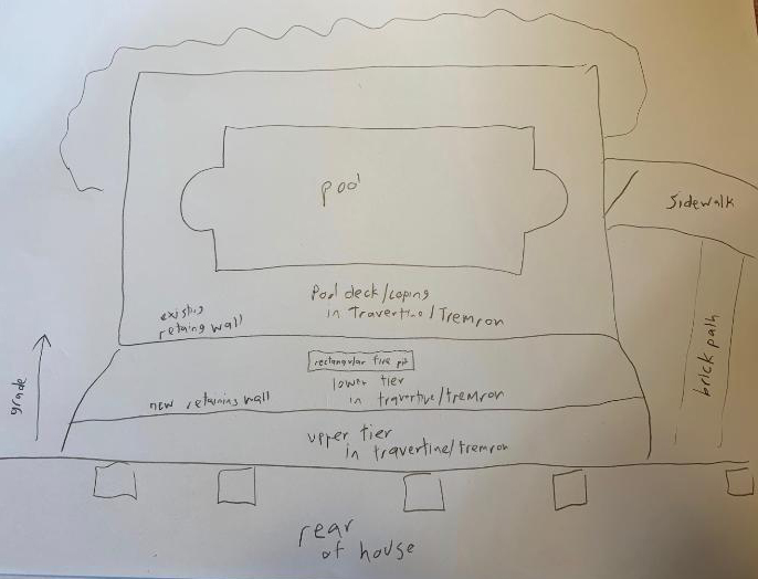 Overall layout - plan 1. Wall separates two elevations with stairs and fencing. Firepit and built-in seating. Travertine pool deck. Paver upper deck with travertine inlay to tie in to bottom.