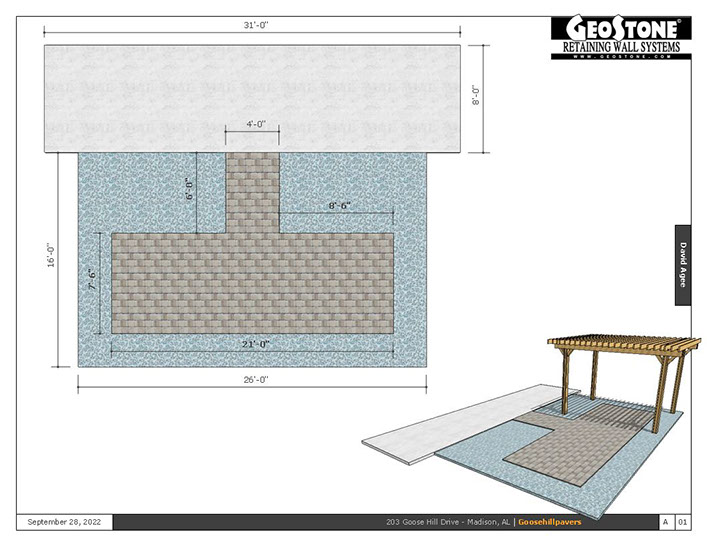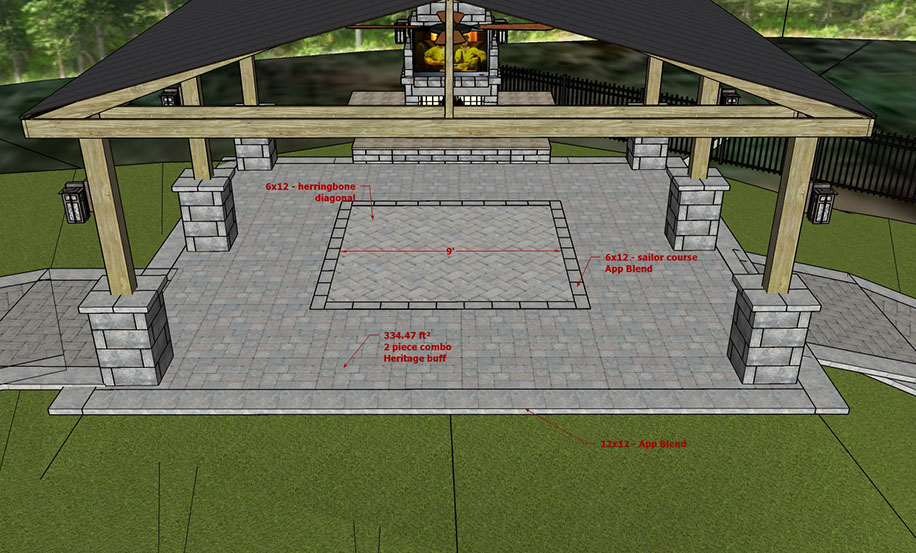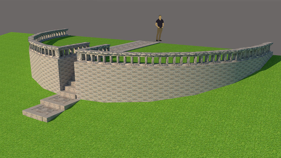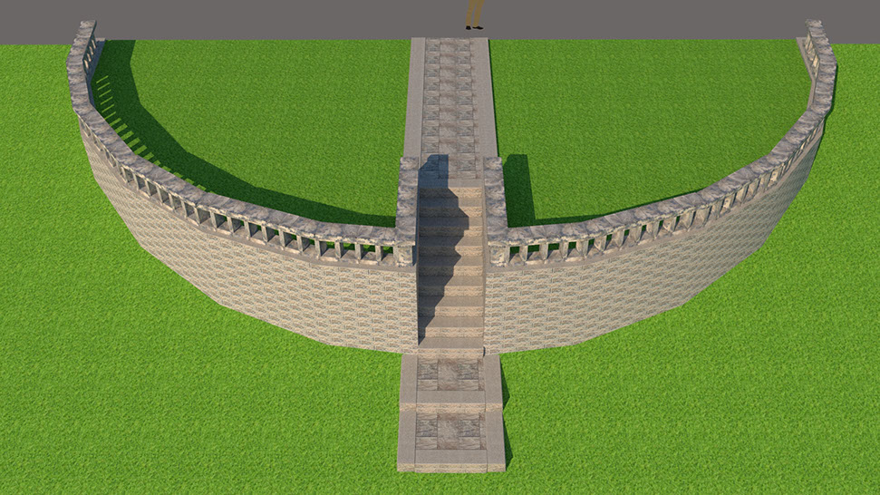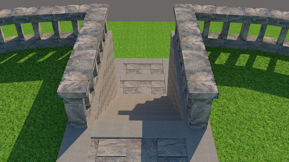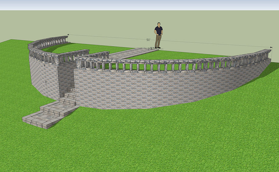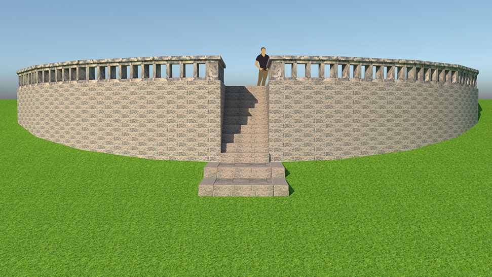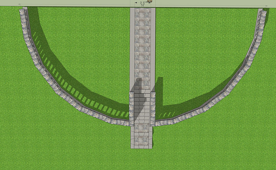 Pre-rendered dimensions layout. Semicircle wall with stairs and paver landings as specified by contractor.