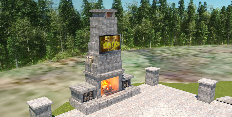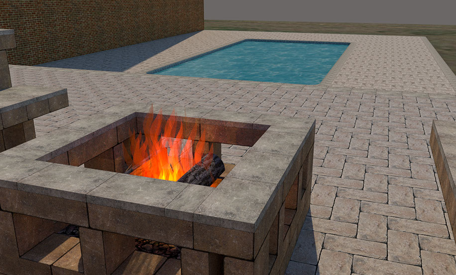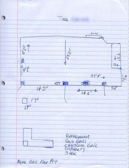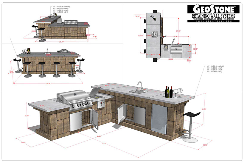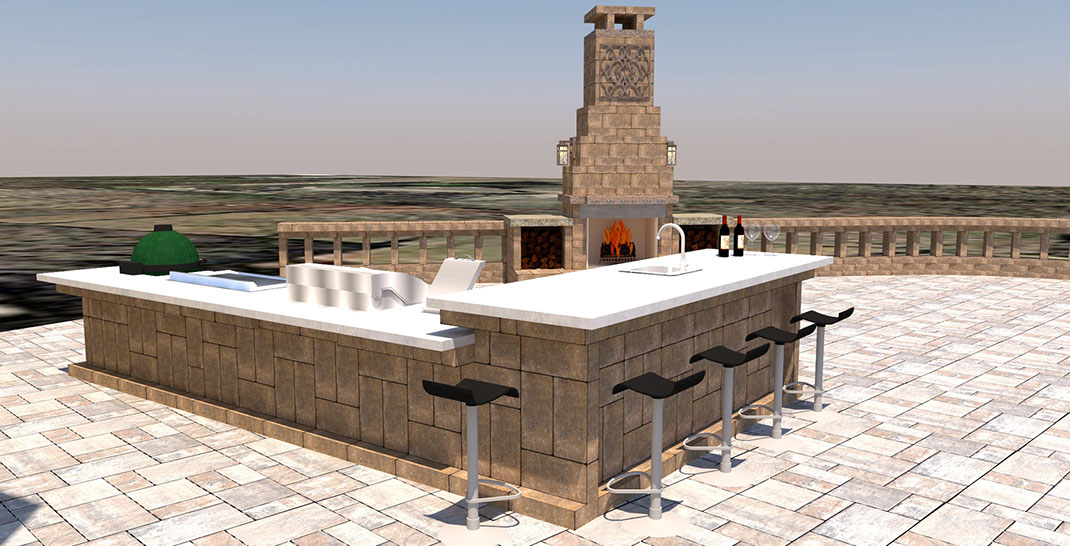 Design custom modular outdoor kitchen to replace firepit on existing concrete patio. Option - replace stamped concrete with flagstone.