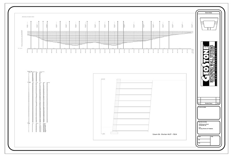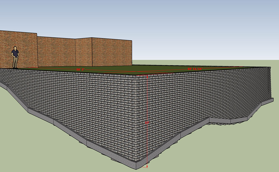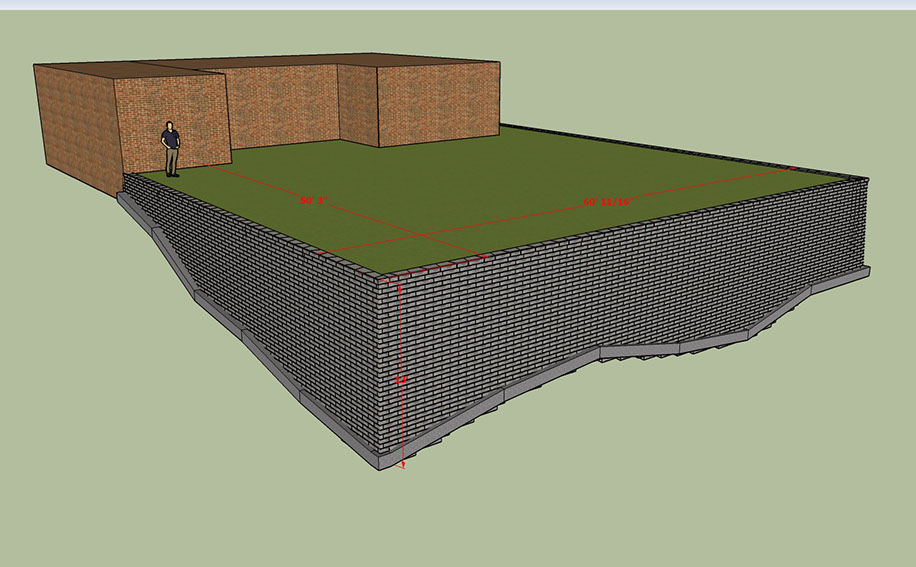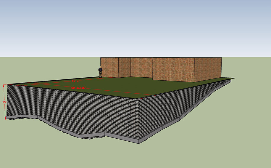 This shows how the wall batter tapers on the sides and the wall footing follows natural contours of the existing grades.