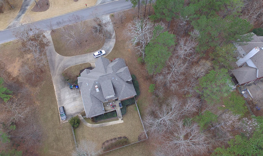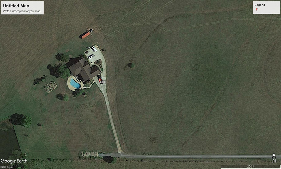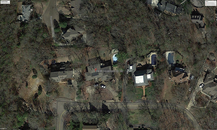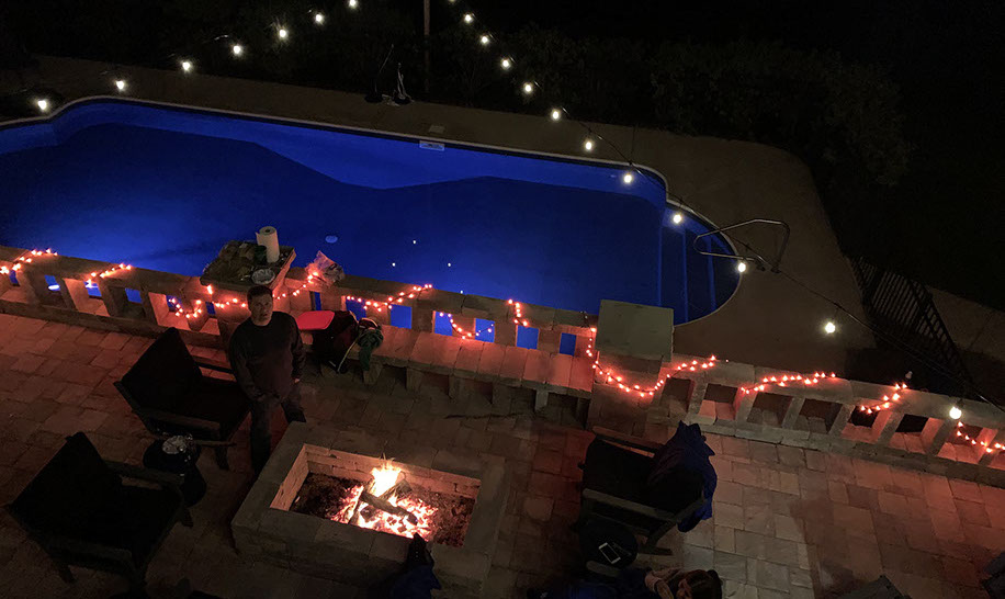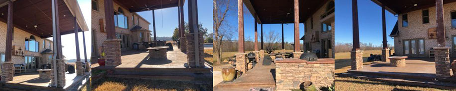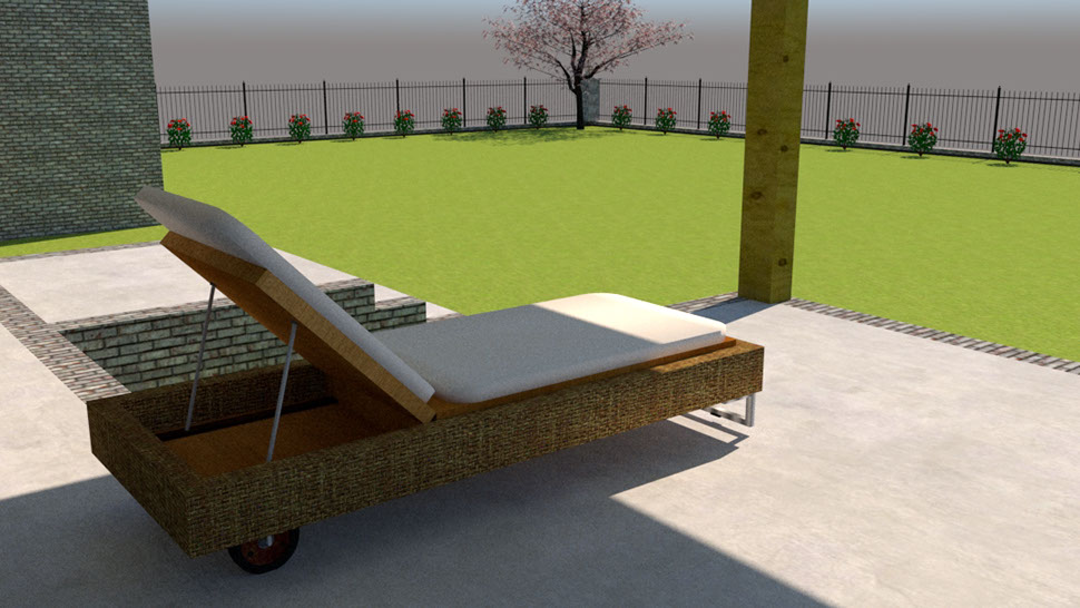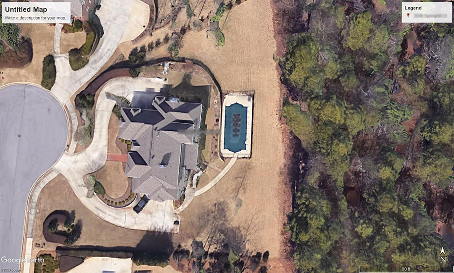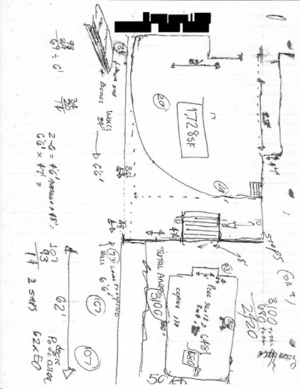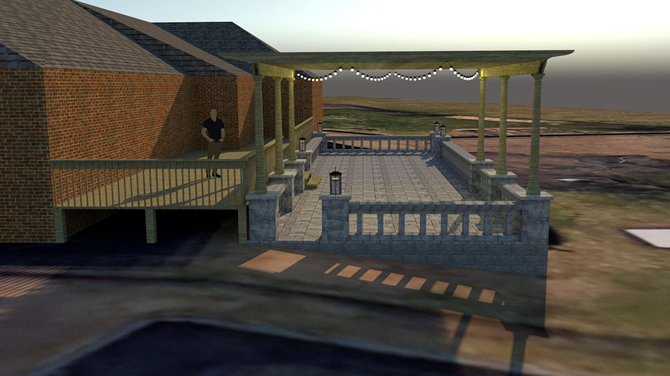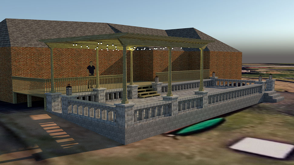 House dimensions from satellite used to design proposed raised patio with columns, fence-wall, lights and pergola.