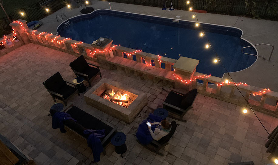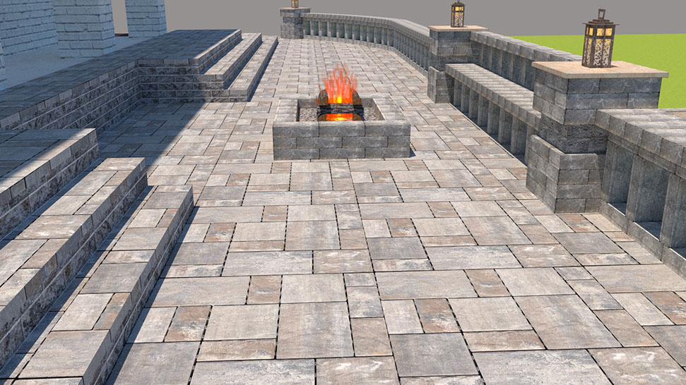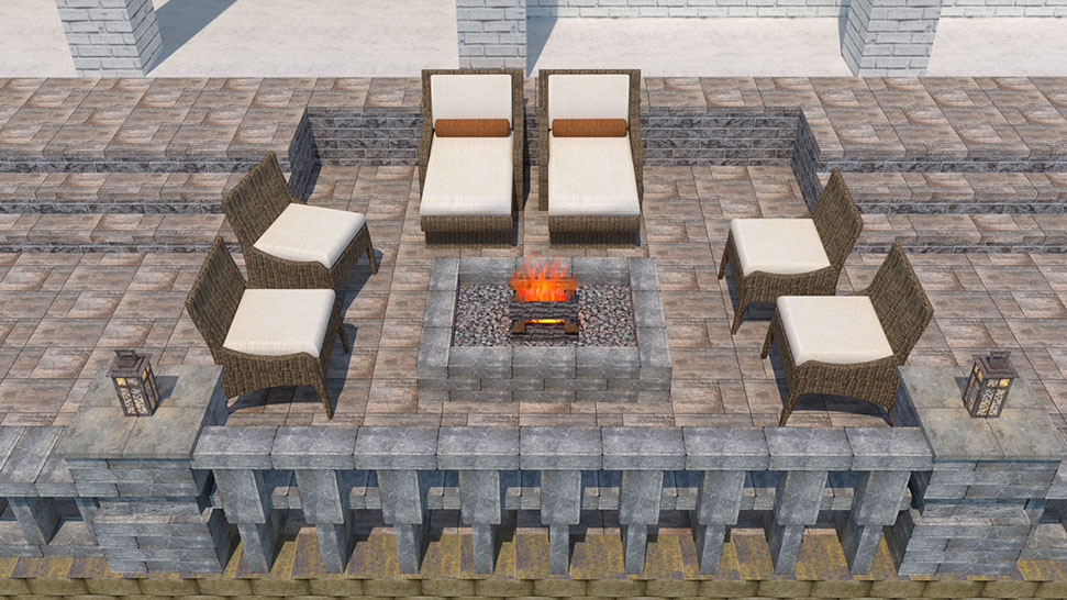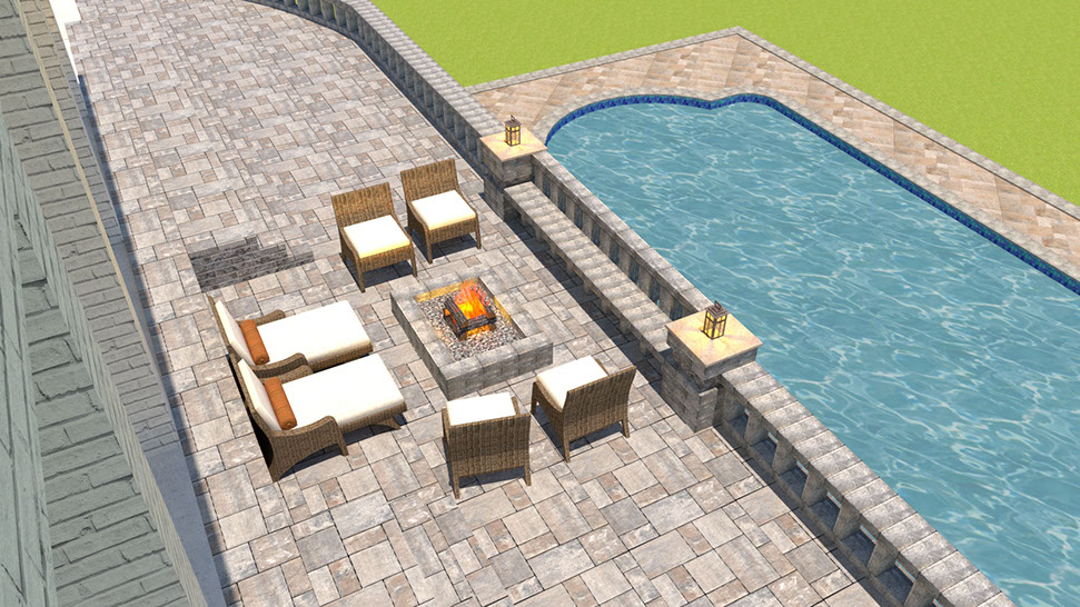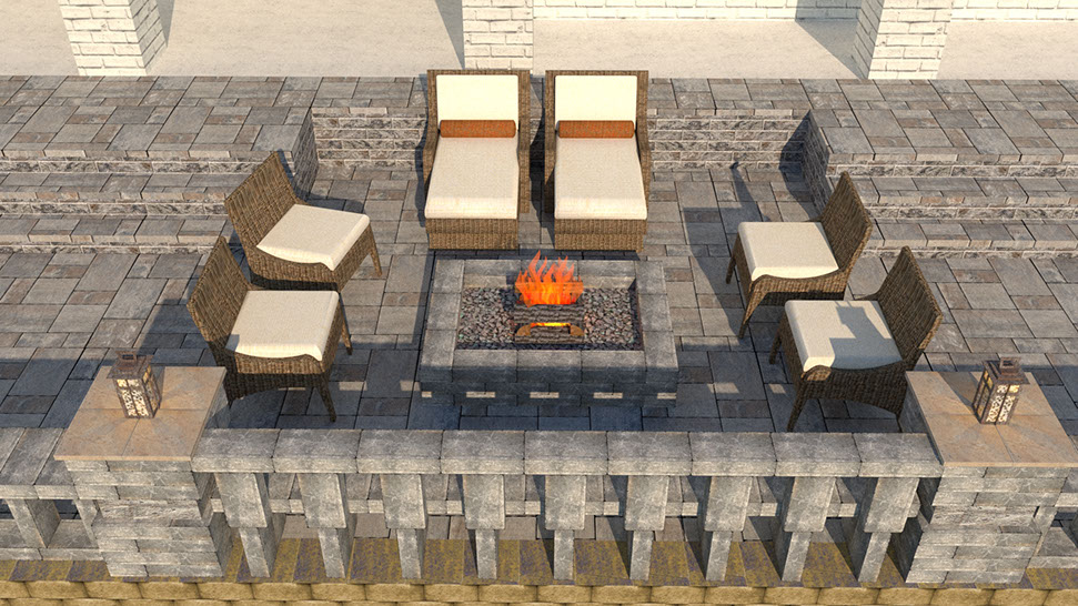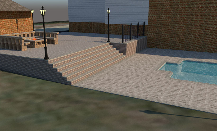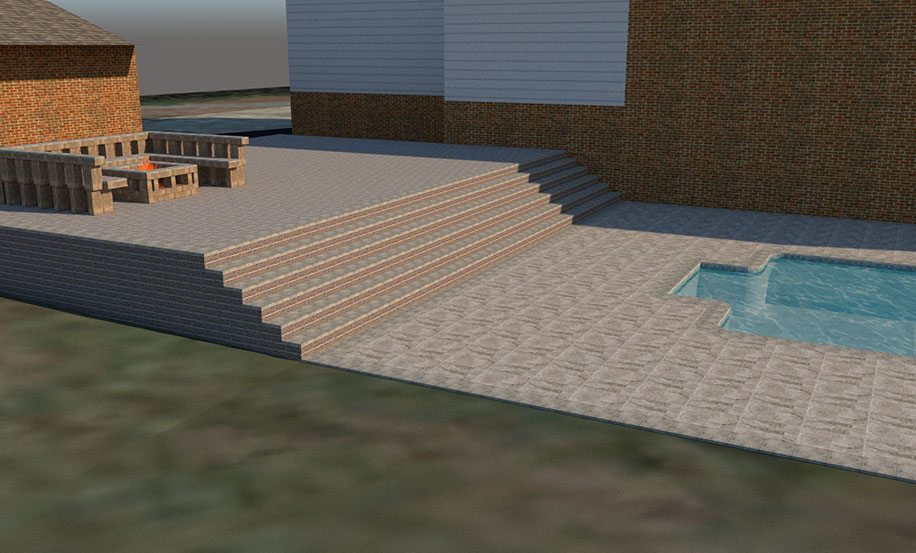 Layout without outdoor furniture to show extra seating with steps and Seat-wall. Design to entertain large crowds in relatively small space. Previously, area was unusable.