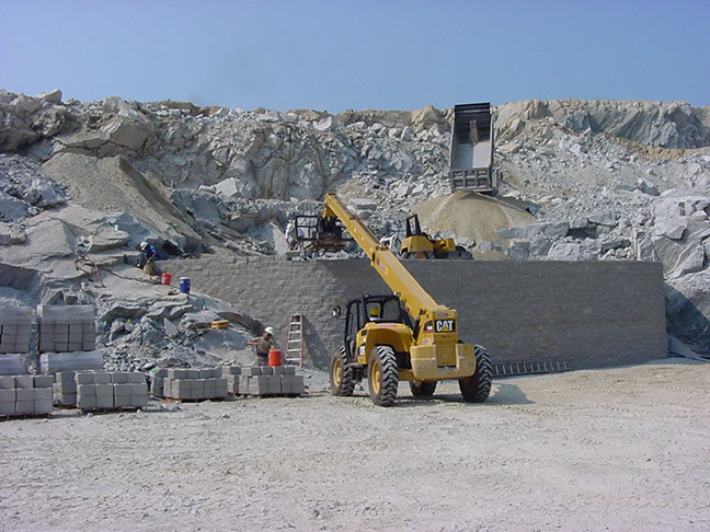47 ft tall wall in Rock Quarry. Indention in top middle for slab to support 200 ton mining trucks. Wall built vertical to allow mining trucks to dump rock into crusher below.